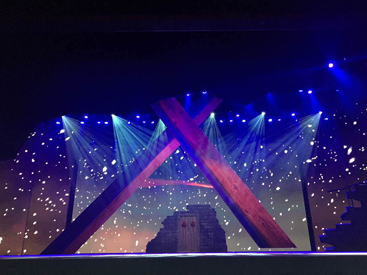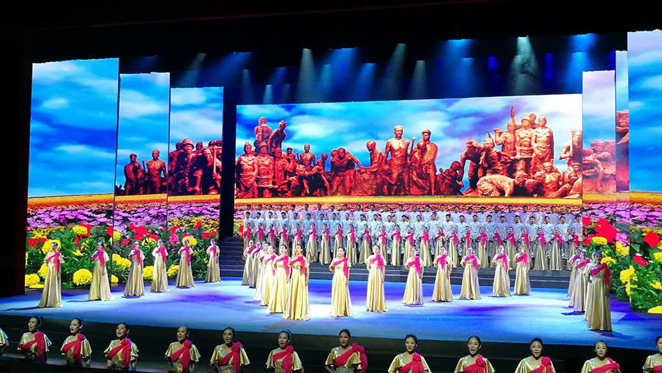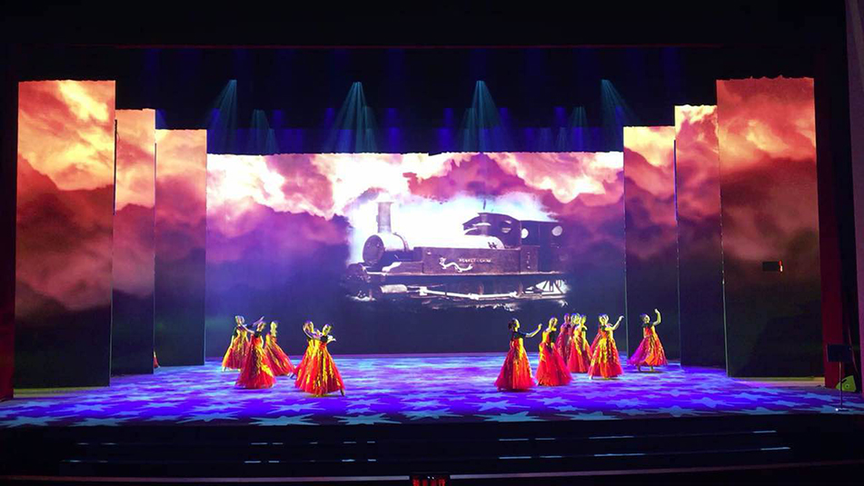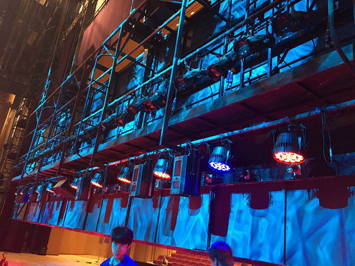"我從舞臺(tái)劇的燈光設(shè)計(jì)思路出發(fā),用沿幕把所有燈具在舞臺(tái)上隱藏起來(lái),使觀眾看不見(jiàn)燈具只看見(jiàn)色彩和光線。這次晚會(huì)共采用了80臺(tái)1500w圖案燈(特寶麗V2500S)、60臺(tái)1500w染色燈、120臺(tái)光束燈(特寶麗PT320B)、160臺(tái)LED燈、40臺(tái)切割燈(特寶麗V3000P)以及4臺(tái)追光燈(特寶麗FS300M)。切割燈特寶麗V3000P主要做面光使用,用于把舞臺(tái)多余的光切掉,使舞臺(tái)更干凈更透亮,同時(shí)也讓演員和舞美道具等清晰可見(jiàn)?!靶′撆凇焙蒲蠊馐鵁鬚T320B主要用于打造炫目的舞臺(tái)效果;我在設(shè)計(jì)中將圖案燈里面的圖案與染色燈的色彩功能充分疊加之后鋪照在舞臺(tái)上,這種方式能夠呈現(xiàn)出更加繽紛和絢麗的圖案效果;地流燈和側(cè)光的運(yùn)用則讓每一位演員都在舞臺(tái)上呈現(xiàn)更加立體。