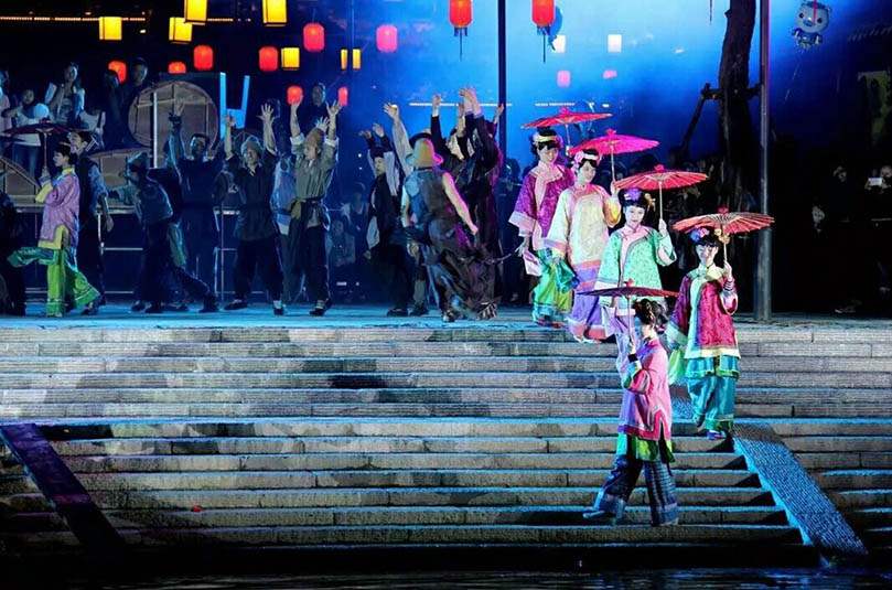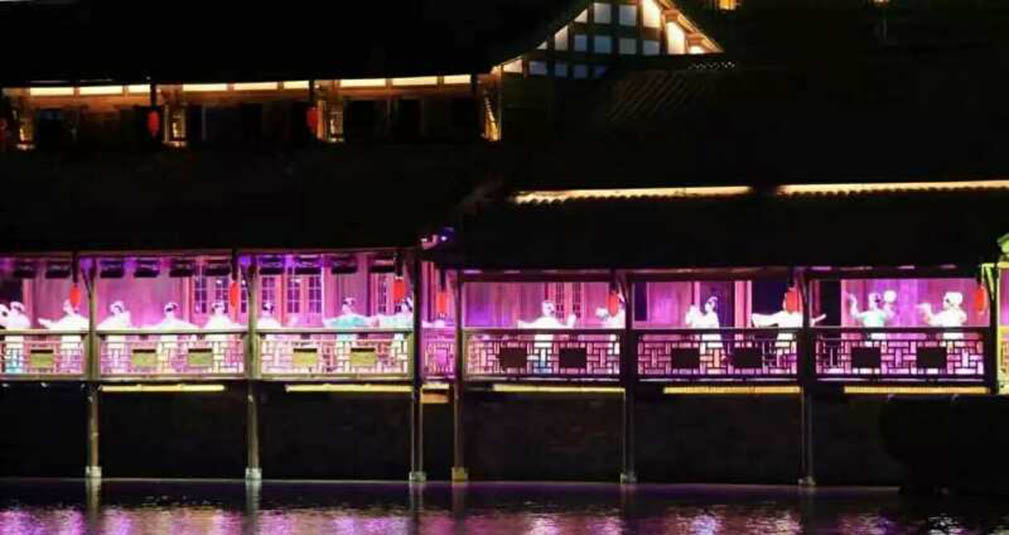 《夢(mèng)回穿紫河》圍繞“河”“船”“人”三個(gè)關(guān)鍵詞,分“紫漁歌”、“依水筑城”、“河街舊事“、“浪漫之旅”四個(gè)篇章,利用大船、燈光、煙花等元素,將常德文化與現(xiàn)代機(jī)械光電技術(shù)結(jié)合,還原包括“古河”、“桃花源”、“沅水號(hào)子”等文化藝術(shù)印象,將觀眾帶入一個(gè)光與影交相輝映、水與人和諧共存的美好境界。乘坐“水上巴士”沿著11公里長(zhǎng)的穿紫河河道游覽,享受常德老河街原景、折子戲、常德絲弦、劉??抽砸魳穭〉葘?shí)景演出,再配合燈光特效等高科技手法,常德本地民俗文化與現(xiàn)代科技的完美結(jié)合,打造出一場(chǎng)古典與現(xiàn)代結(jié)合的唯美大賞。