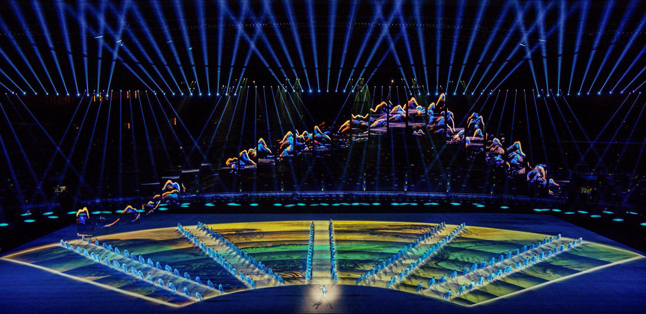 運(yùn)動(dòng)會(huì)開(kāi)幕式的舞美設(shè)計(jì)以呈現(xiàn)山西特色為重點(diǎn),以寫意的方式展現(xiàn)山西人文魅力和精神風(fēng)貌。借助威亞系統(tǒng),25塊彩幕隨著演出內(nèi)容在空中變換造型,與地面全景投影相得益彰,打造一場(chǎng)歷史積淀與科技創(chuàng)新交織融合,人文魅力與時(shí)代精神交相輝映的開(kāi)幕式表演。