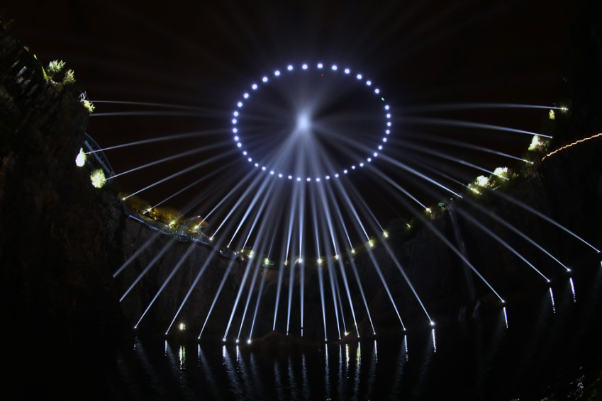 總導(dǎo)演王之綱最初的設(shè)計靈感來自于深坑酒店特殊的結(jié)構(gòu)和位置,建筑在一個環(huán)形深坑里的深坑酒店有著天然的回音結(jié)構(gòu)。因此,在被世茂集團(tuán)邀請為深坑酒店設(shè)計一場量身打造的新媒體藝術(shù)秀的時候,王之綱提出了“回響”這個概念。