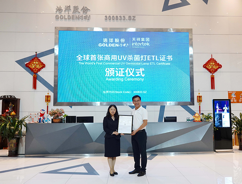 浩洋股份作為專業(yè)照明行業(yè)的高新技術企業(yè),自始至終堅持嚴苛的品質(zhì)管理。在今年疫情蔓延的嚴峻環(huán)境下推出GOLDENSEA UV品牌的紫外消毒燈具產(chǎn)品,代表了浩洋股份對健康科技的重視、對專業(yè)照明相關領域延伸的能力與決心。據(jù)了解,浩洋股份的GOLDENSEA UV的產(chǎn)品此前已都通過了歐洲的CE認證獲得了歐洲市場的通行證,本次能夠順利獲得Intertek全球首張商用UV燈ETL證書,不僅提高了GOLDENSEA UV的國際市場競爭力,打通了北美市場的通道,更是證明了浩洋股份對產(chǎn)品卓越品質(zhì)的追求。