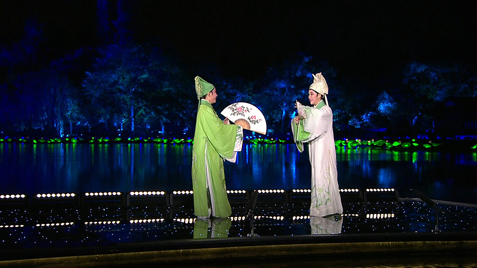 不同于傳統(tǒng)舞臺,利用西湖的自然水面作為表演場地也給《最憶是杭州》文藝晚會的光位設(shè)計(jì)帶來了不小的挑戰(zhàn),現(xiàn)場干凈、有力的面光和側(cè)光等光位的運(yùn)用,使得被照物體清晰可見的同時(shí)又塑造了較好的人物輪廓。